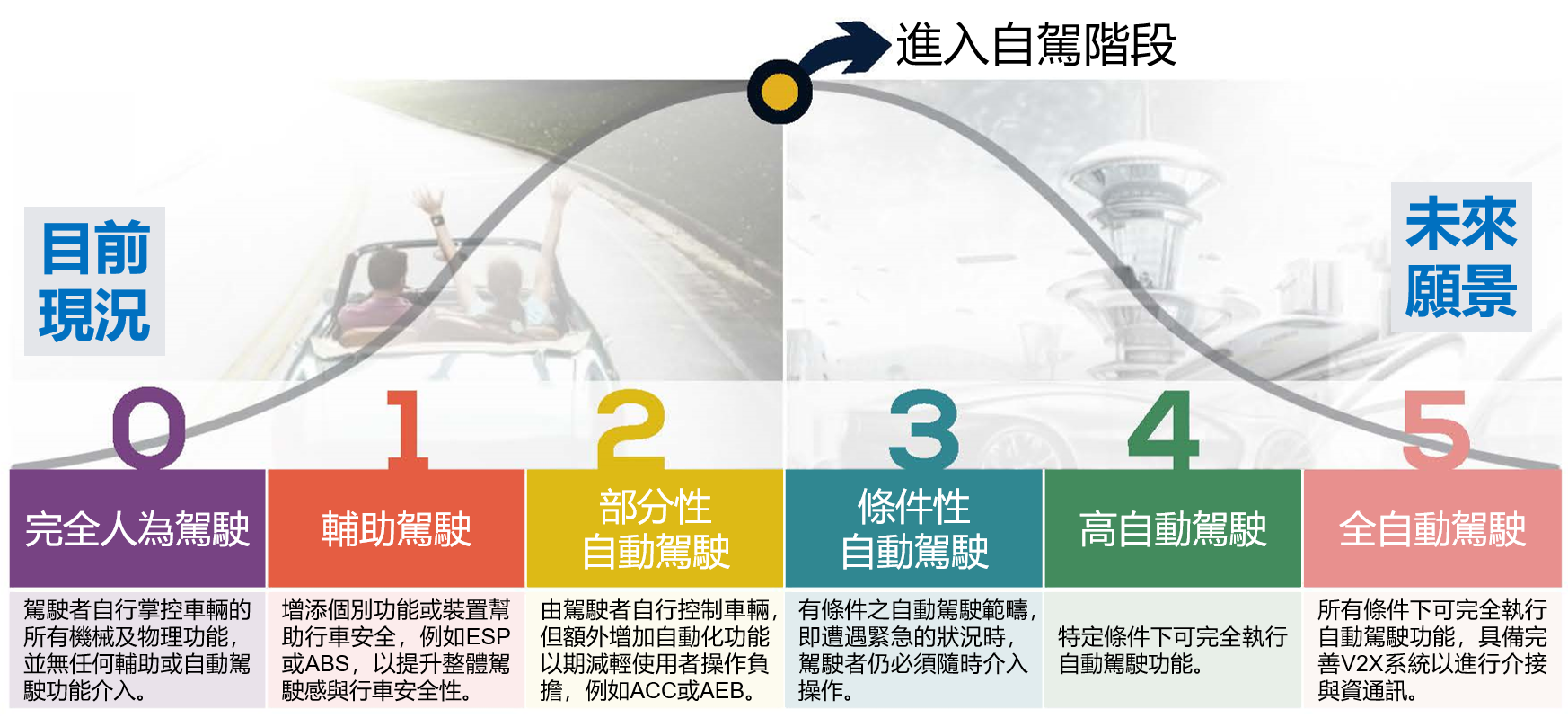 對於現今的自駕車, 高級輔助駕駛系統 (ADAS) 被歸類為等級 2 到 3 ,而無人化的完全自動駕駛則被歸類為等級 4 到 5 。
