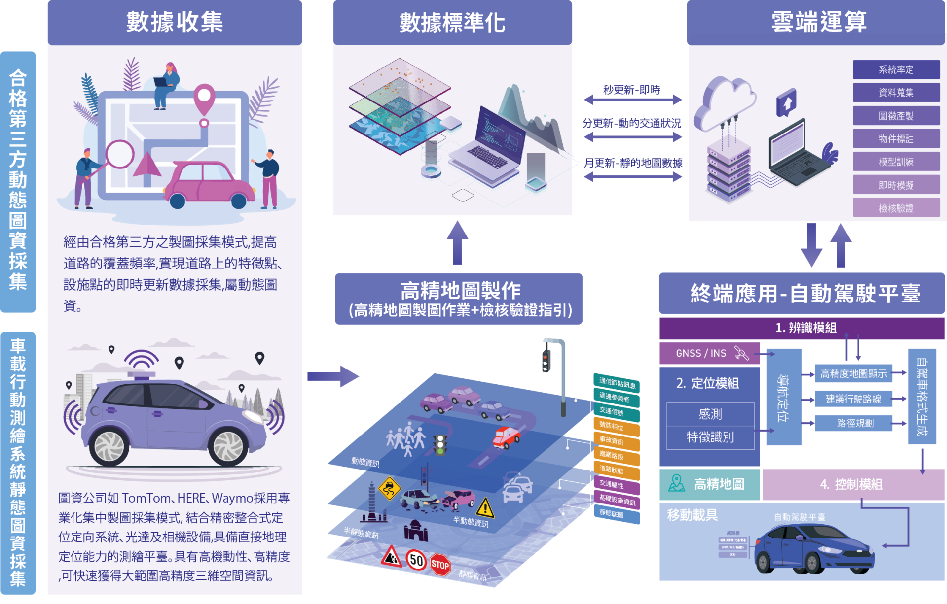 內政部與高精地圖中心共同推動,建構一套以內政部概念為核心的完整高精地圖生態系統。該系統整合專業車載行動測繪系統的靜態地圖資料,並結合第三方驗證系統之動態圖資,提供自駕系統精確且即時的地圖支援。